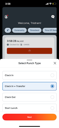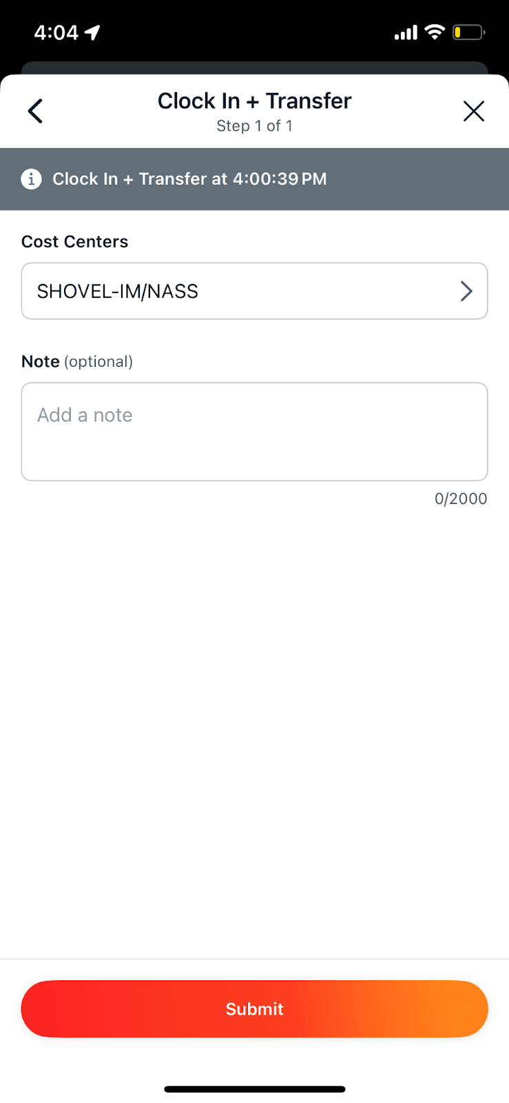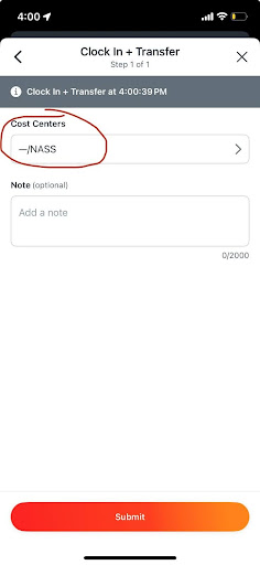Select Clock In + Transfer so that you can specify the job in the next step.